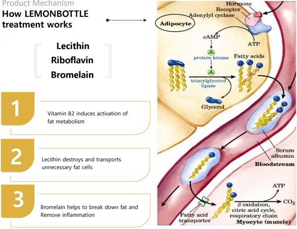 LemonBottle is a new premium fat dissolving injectable that is unique from other fat dissolving products available in that it does not contain Phosphatidylcholine (PPC) or deoxycholates. Instead, Riboflavin, Bromelain and Lecithin are utilised to destroy fat cells and promote effective excretion from the body.
